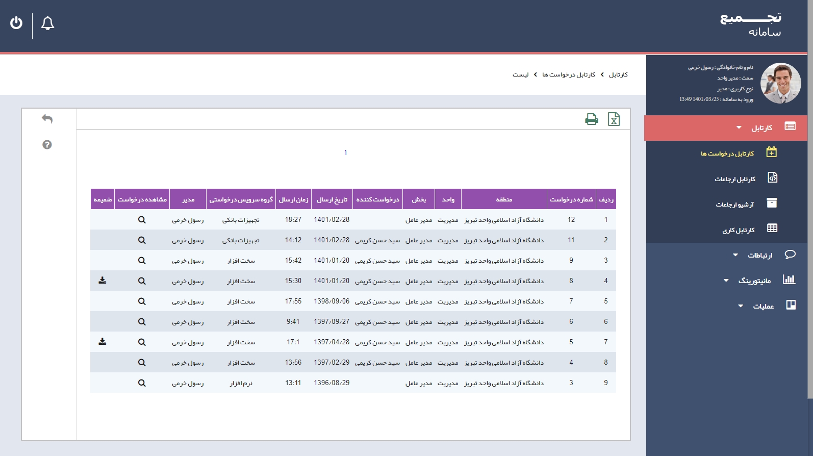 تمام درخواست هایی که مرتبط به واحد تعمیر و نگهداری IT است به کارتابل کاری مدیر ارسال می شود . مدیر در این کارتابل امکان مشاهده درخواست ، واحد و بخشی که پرسنل در آن مستقر است قراردارد.