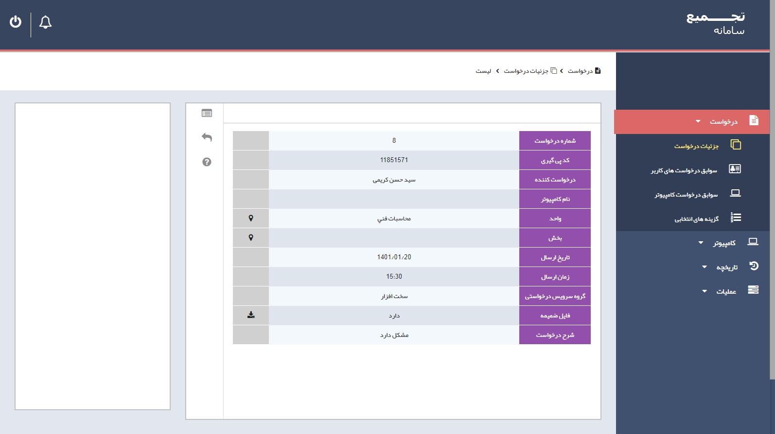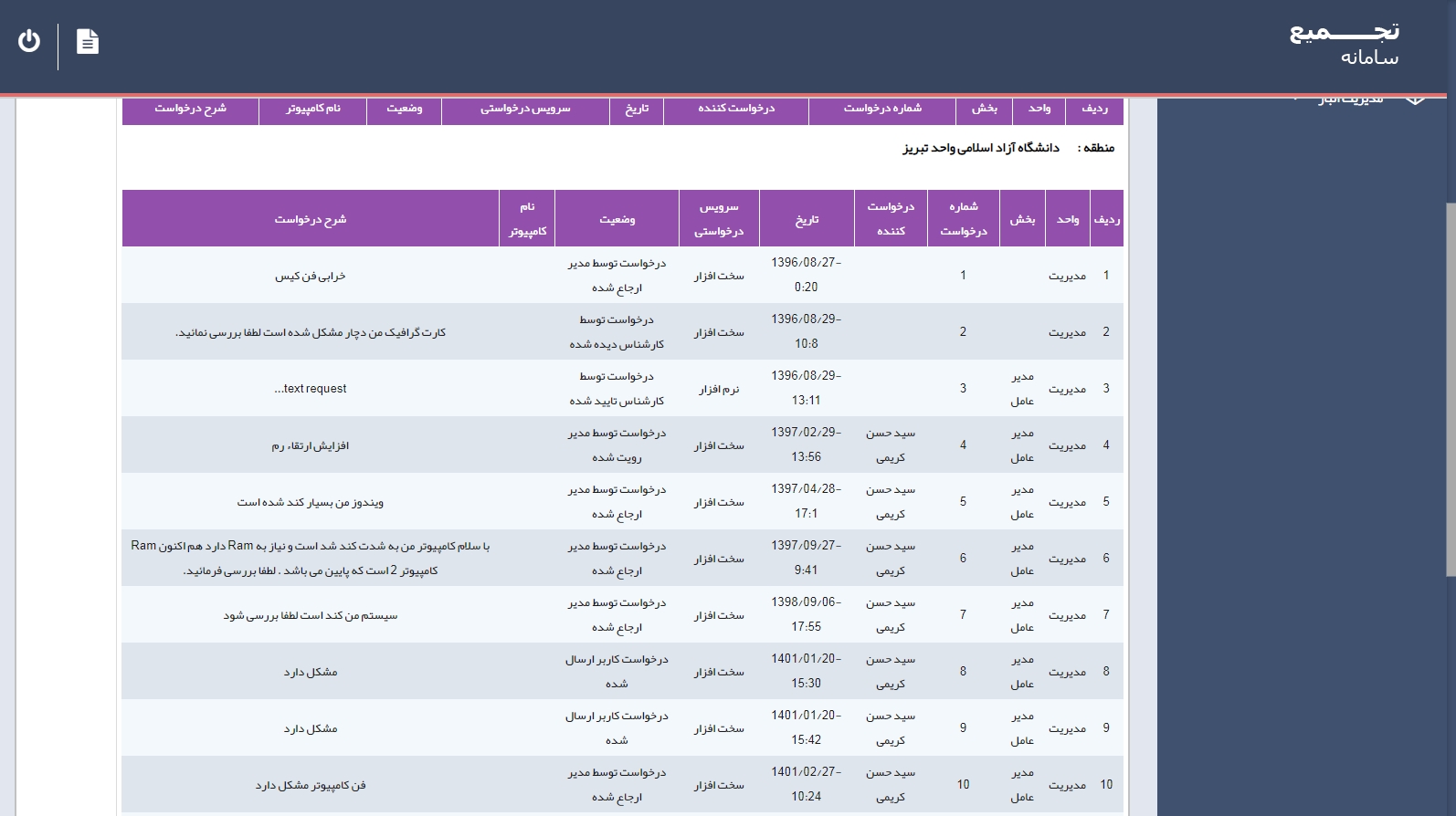 سوابق درخواست کامپیوتر : به دلیل امکان جابجائی پرسنل یک سازمان ، درخواست های ارسال شده در مورد کامپیوتر ، با درخواست های ارسال شده کاربر متفاوت باشد و مدیر می تواند سوابق موجود و مشکلات به وجود آمده برای یک کامپیوتر را در این بخش مشاهده نماید.