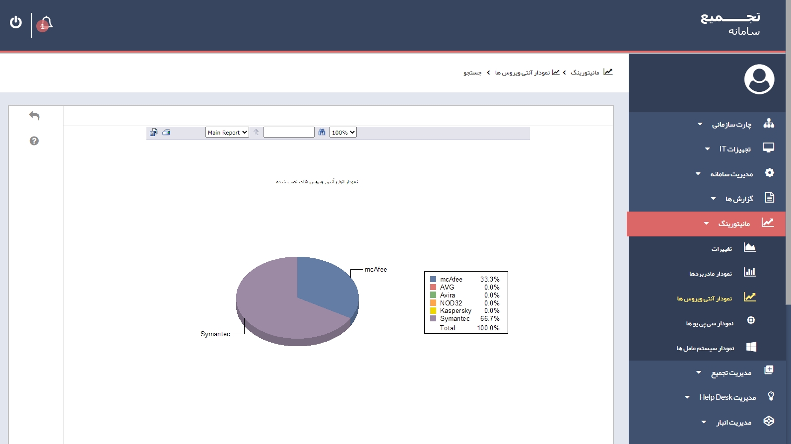 امکان مشاهده نمودارهایی از انواع مادربردهای کامپیوترهای سازمان ، انواع آنتی ویروس های نصب شده روی کامپیوترهای سازمان ، انواع CPU های موجود در کامپیوترها ، و انواع سیستم عامل های موجود به تفکیک مناطق ، واحد ها یا بخش های سازمان را گزارش گیری کرد.